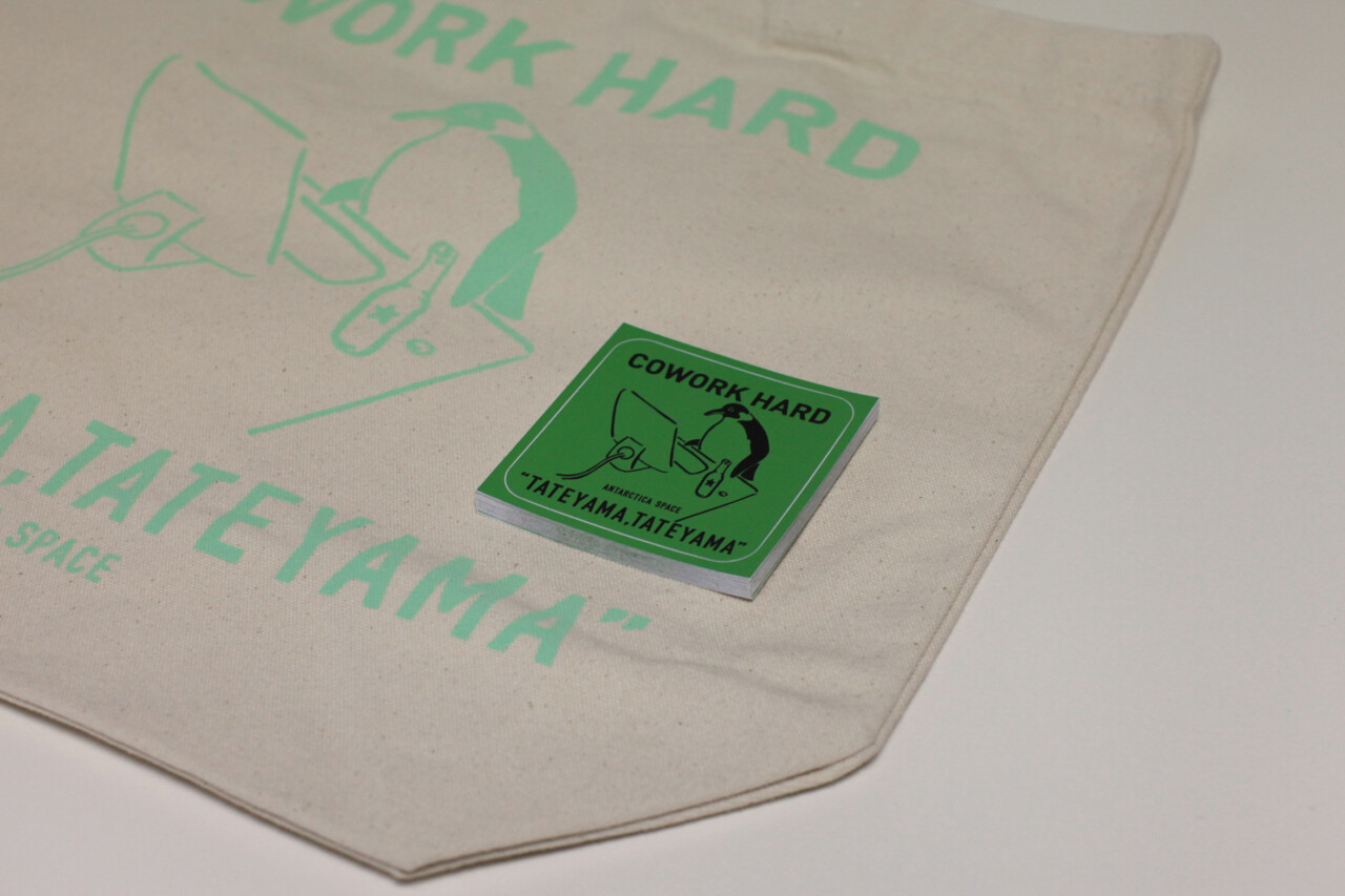 アグイジェ社が運営する シェアオフィス 兼 コワーキングスペース「南極(なんきょく)スペース」のショップカード、ステッカー、トートバッグの作成を行いました。