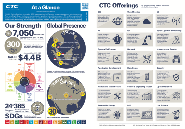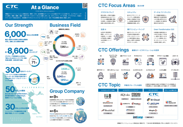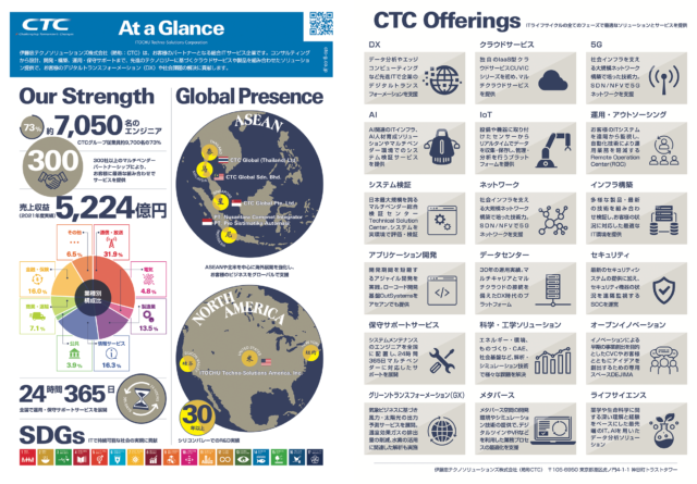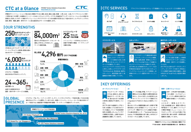 伊藤忠テクノソリューションズ(CTC)の事業内容や概要をまとめたフライヤーデザインを担当しました。CTC本社や各事業所で配布され、ホームページ上でもダウンロードいただけます。