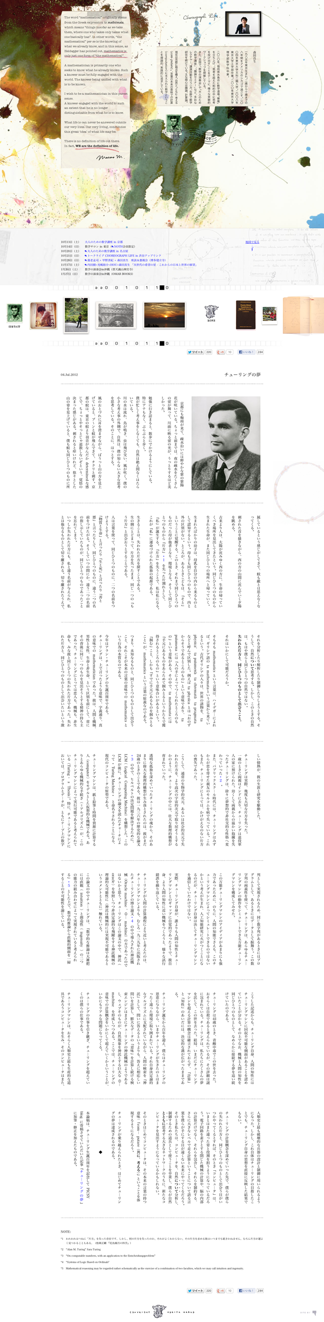 山縣 良和さんのアートワークをベースに、新しさと驚きに満ちた知の世界を垣間見ることのできるサイトに仕上がっています。数学者チューリングの理論を抽出したアニメーションやエヴァリスト・ガロアの切手など随所に森田さんのこだわりが隠されています。