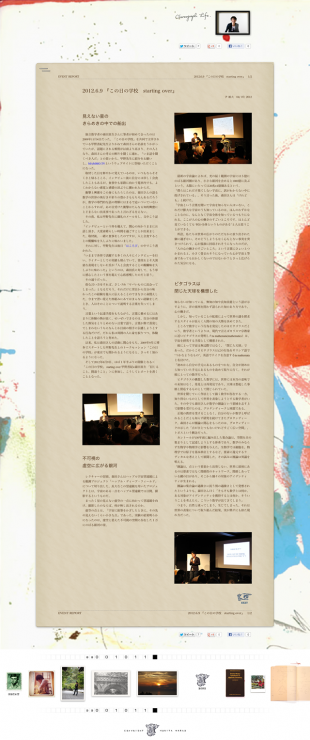 WordPressを導入し、イベント情報やインタビュー記事を作成、更新できるようになっています。ただしグローバルナビゲーションがないため、インタビュー記事・イベントレポート・コラムを閲覧するためにはすべてのボタンをクリックし、中身を確認する必要があります。ぜひ探してみてください!