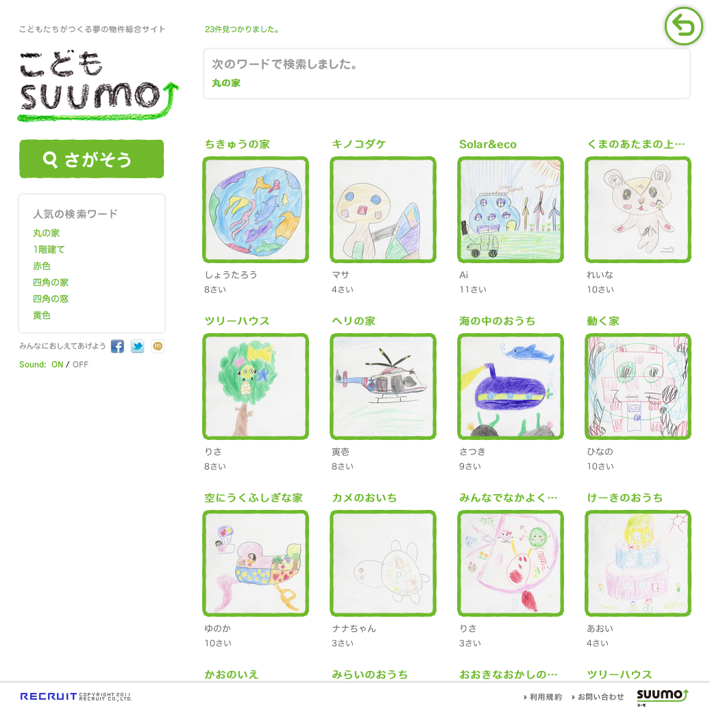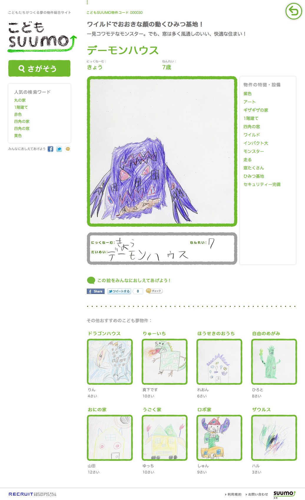 こどもたちがつくる夢の物件総合サイト “こどもSUUMO”。『あっ、こんなお家に住んでみたい!』をテーマに子供たちが自由な発想で描いた、夢あふれる物件の数々を紹介しています。