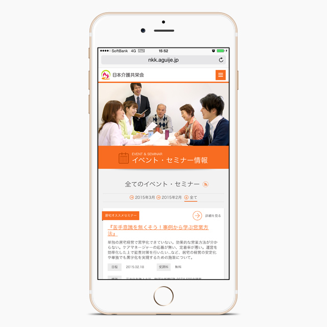 PC/SPでのレスポンシブ設計。またWordpressを実装しイベントスケジュールや活動報告ブログなどを管理運営しています。デザイン面に関しましては、既存のロゴからサイトカラーを決定し「介護に携わる人たちのイキイキ」感を意識しつつ制作しております。