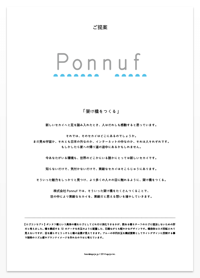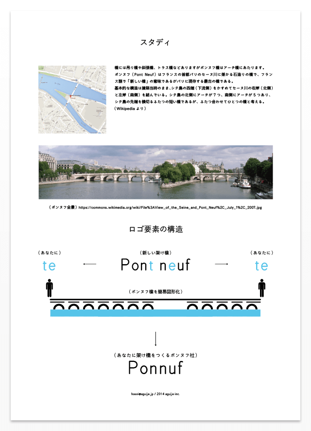 Ponnufは「新橋」という意味の、パリにある最古の石橋です。実際にある橋をロゴとしてどう消化するか、数ある橋モチーフのロゴに埋没しないためには、といった点を考慮して制作いたしました。