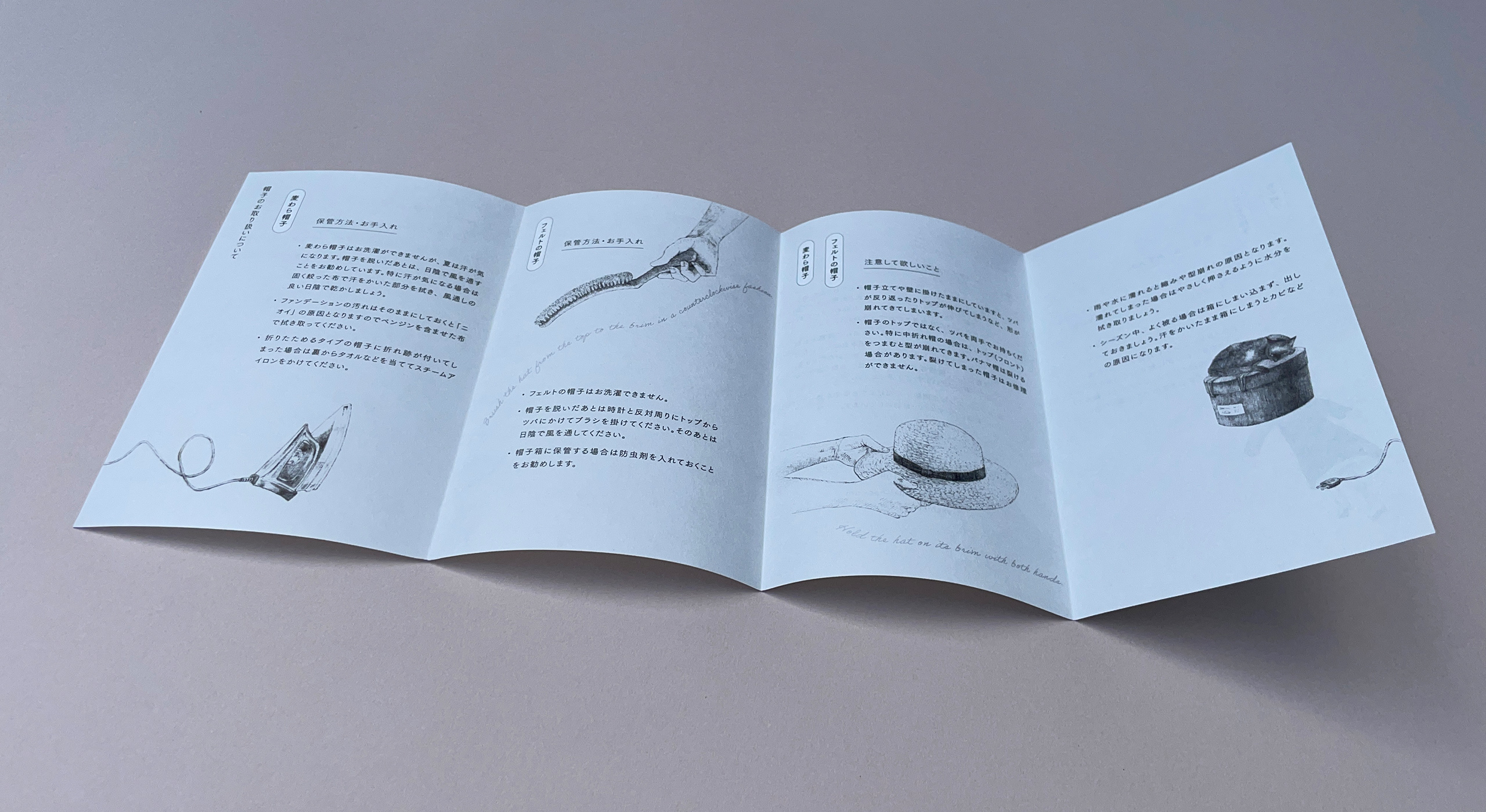 リーフレットでは、メンテナンスや保管方法などのお取り扱いについて、絵本作家・イラストレーターの MARUU さんによる柔らかなドローイングとともにご紹介しています。大切な帽子と長くお付き合いいただくためのヒントを、心を込めてまとめています。ぜひご覧になってください。