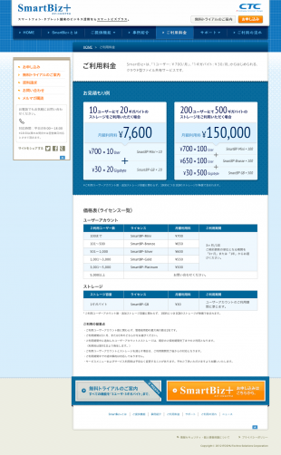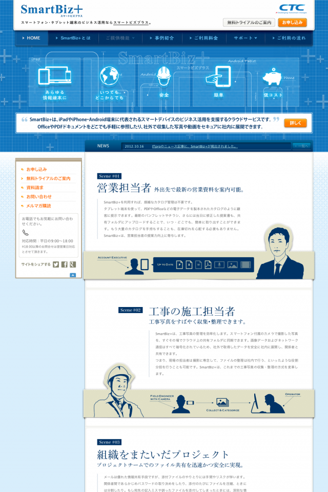 法人利用に特化したCTCのクラウド型ファイル共有サービス、SmartBiz+(スマートビズプラス)のウェブサイト構築のお手伝いをさせていただきました。
