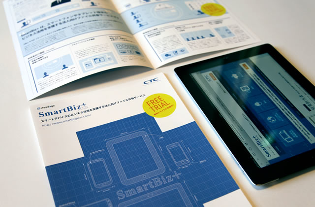 法人利用に特化したCTCのクラウド型ファイル共有サービス、SmartBiz+(スマートビズプラス)のブローシャー制作のお手伝いをさせていただきました。